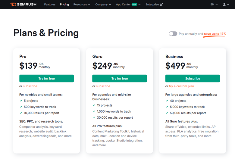 SEMrush is an clearly one one of the most extensive paid SEO ranking tools that offers both a broad overview and an in-depth analysis of your keywords and backlinks. Its robust data capabilities position it among the leading SEO tools available in the market.